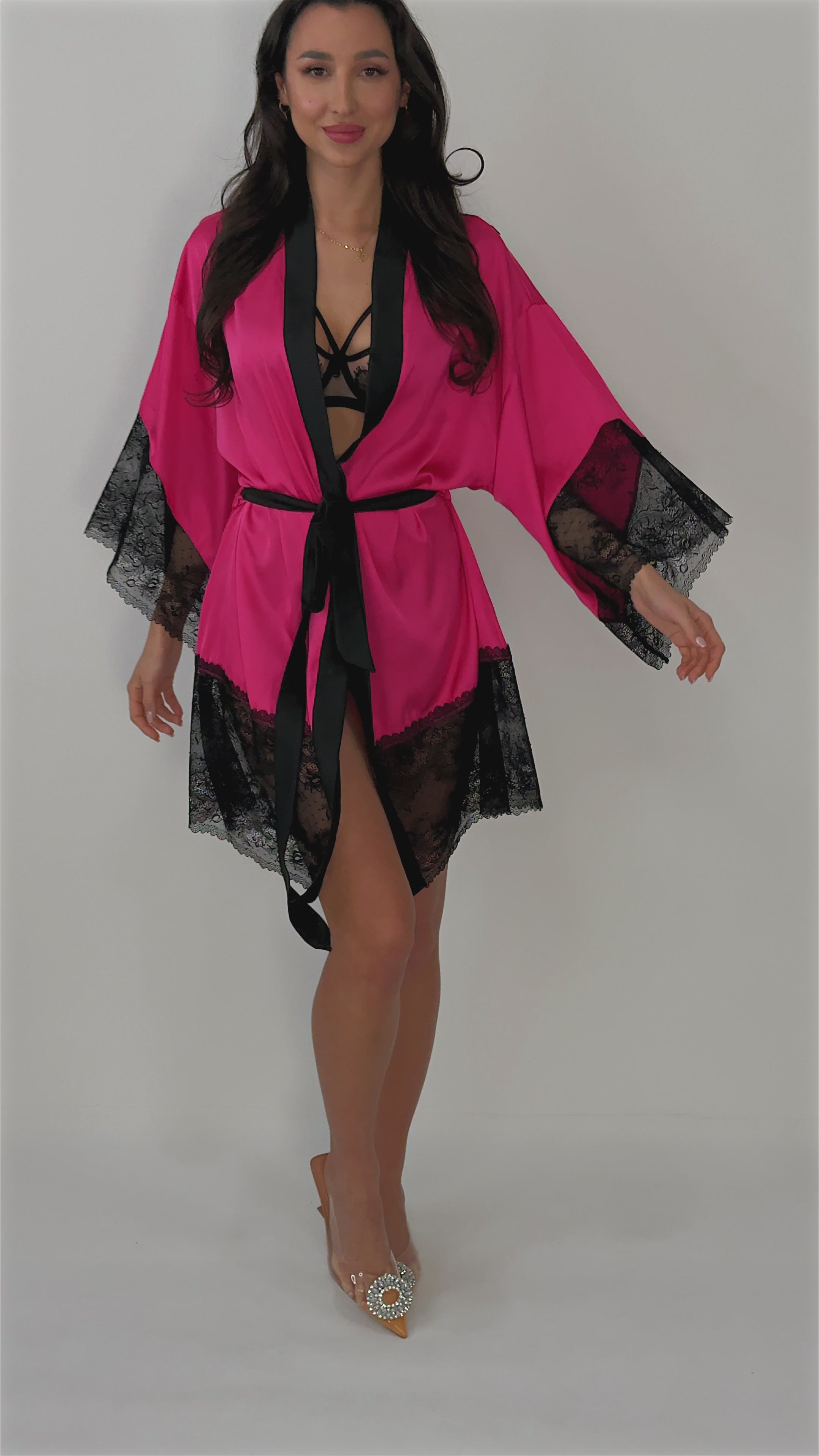 Bude perfektně doplňovat vaše spodní prádlo. Krajkové vsadky dodají romantický a lehký nádech. Župan se zavazuje v pase.